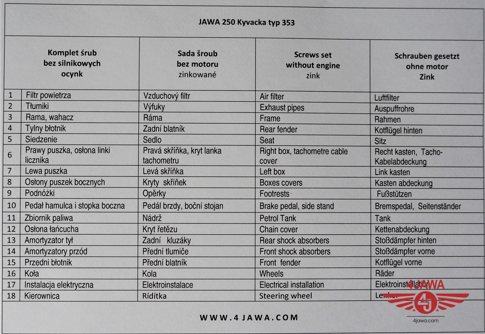 Komplet śrub, bez silnikowych, ocynk, Jawa 250/353