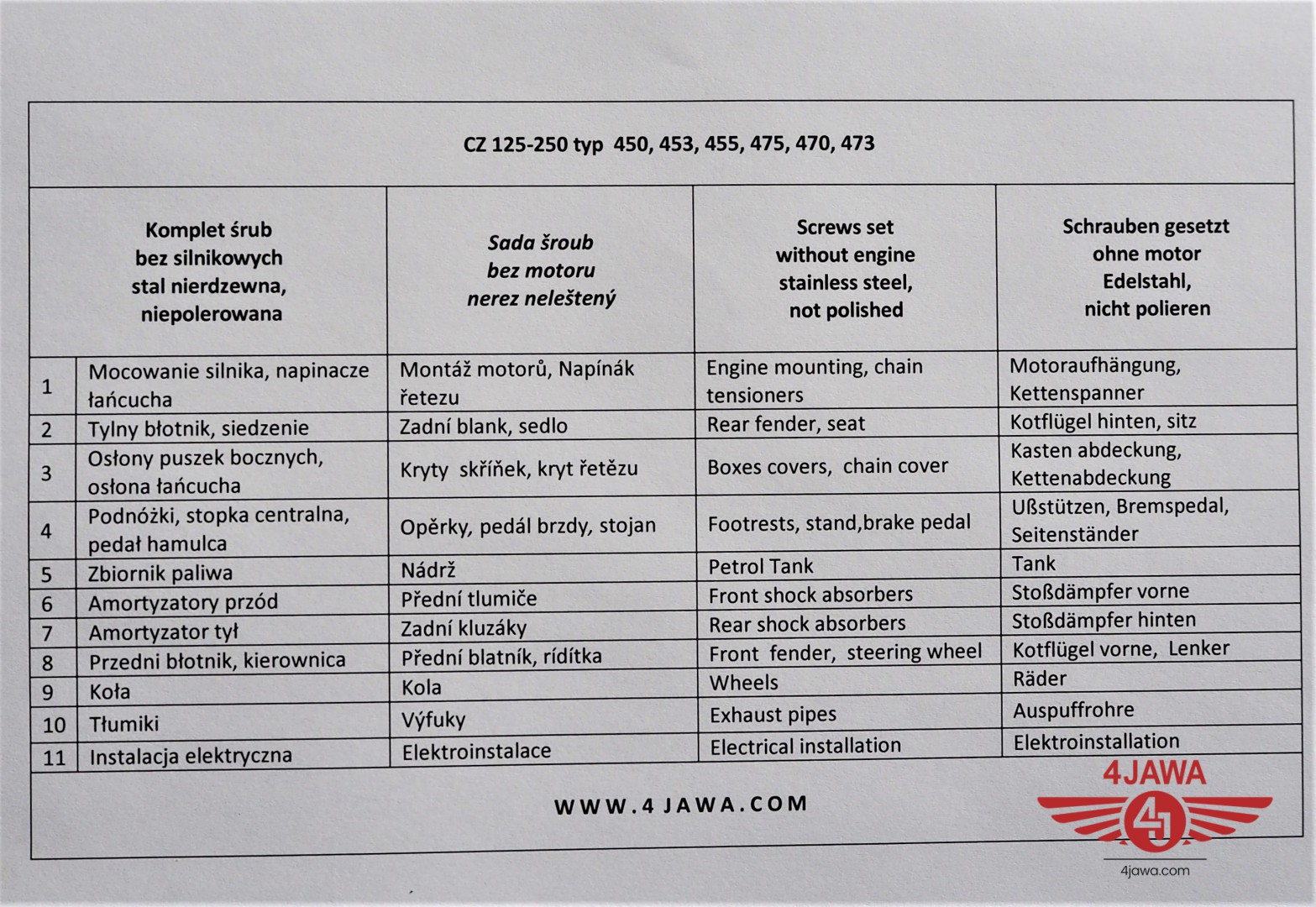 Komplet śrub, bez silnikowych, nierdzewne/niepolerowane, CZ 125-250 typ 450/453/455/475/470/473