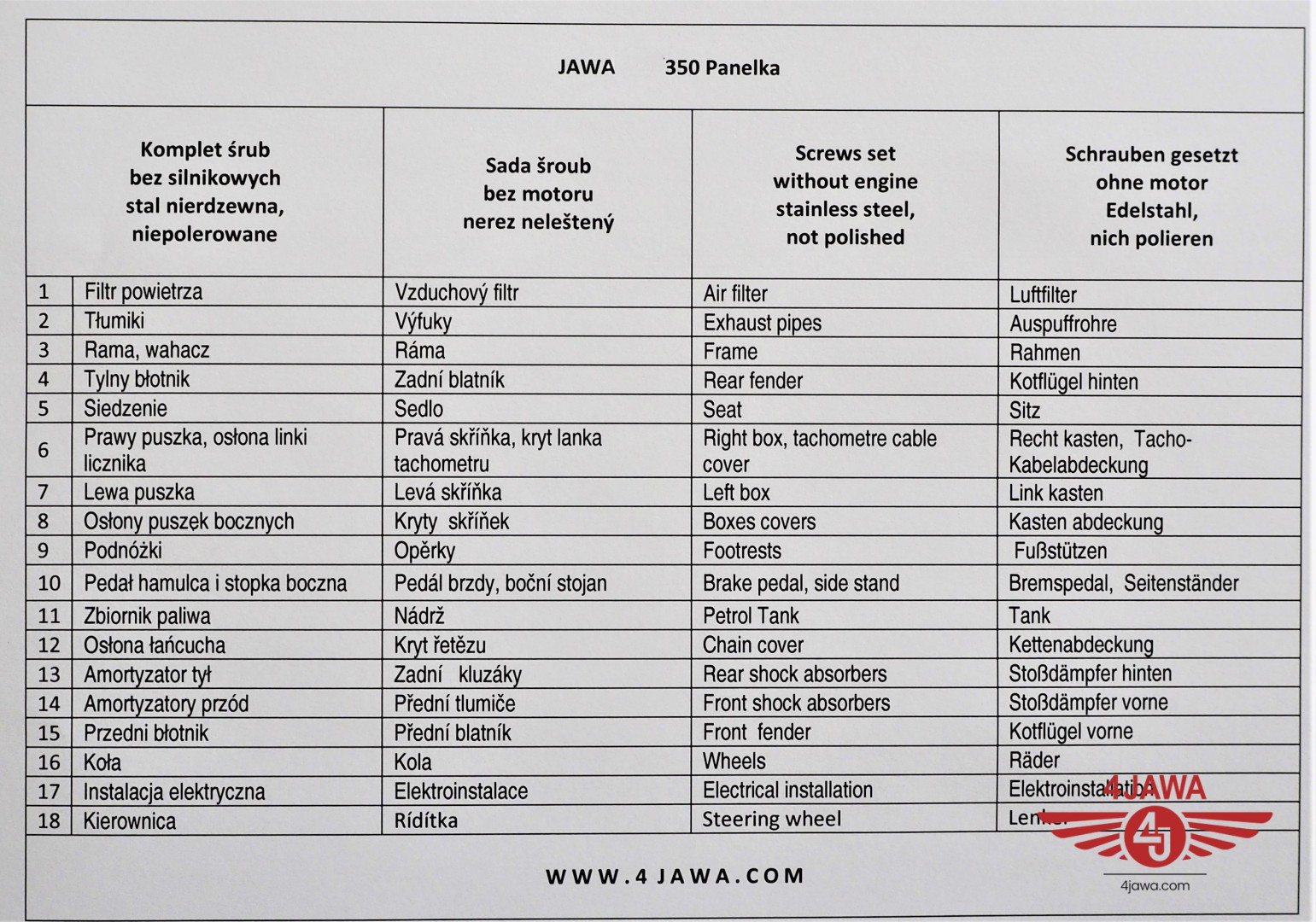 Komplet śrub, bez silnikowych, nierdzewne/niepolerowane, Jawa 350 Panelka typ 360/361