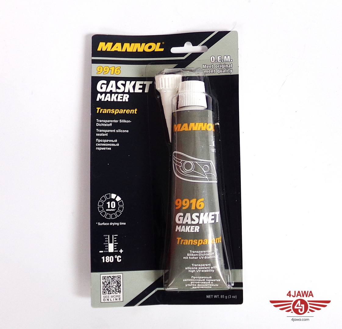 Gasket Maker Transparent, uszczelniacz (przezroczysty) wulkanizuje się do gumy silikonowej w temperaturze pokojowej. Posiada wyjątkową odporność na działanie wysokich temperatur. Tworzy niezawodne uszczelnienia, nie pęka, nie kurczy się i zmienia się pod wpływem nagłych zmian temperatury. Zastępuje uszczelki z azbestu, gumy, filcu, papieru, korka i uszczelki metalowe. Skuteczny do naprawy elementów: mechanizmu zaworowego, miski olejowej skrzyni biegów, obudowy termostatu. Odporny na smary, chłodziwa, benzynę, naftę, wodę i roztwory kwasu. Łatwy do nakładania, pozostaje elastyczny.Powierzchnia do uszczelnienia powinna być czysta, sucha oraz wolna od oleju i tłuszczu. Nanieść uszczelniacz równomiernie i bezzwłocznie połączyć części bez czasu odparowania. Po naniesieniu na powierzchnię wolną od oleju spłaszczyć i wygładzić powierzchnię ługiem mydlanym. Po 24 godzinach uszczelkę można poddawać obciążeniom. Temperatury pracy leżą pomiędzy -40 °C a +180 °C (na krótko). Przechowywać w szczelnie zamkniętym oryginalnym opakowaniu w suchym miejscu w temperaturach od +5 °C do +25 °C.